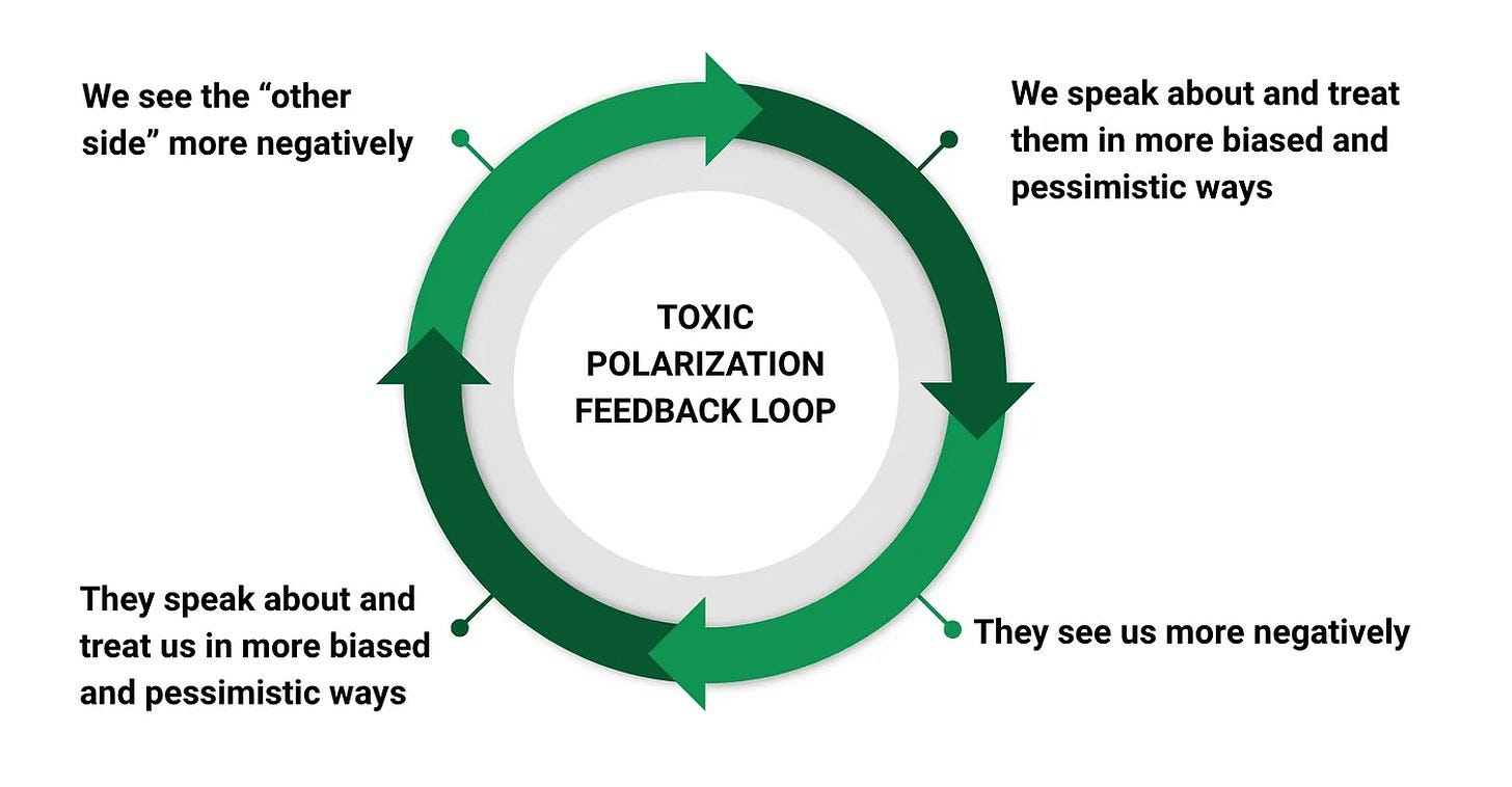 So many of us see our political opponents as clearly the “bad guys” on a slew of important issues. This was the case before 2015 but, since then, toxic polarization has increased greatly, with a steadily increasing number of people viewing the “other side” as immoral, extreme, and dangerous, and even more hateful.